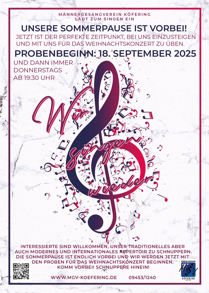 Es ist ein optimaler Zeitpunkt hineinzuschnuppern oder ohne Druck und unverbindlich in Form eines Projektchores bei uns mitzusingen. Daher laden wir alle Interessierten ein, zu unserer Singstunde am/ab Donnerstag, 18. September 2025 um 19:30 Uhr, im Gemeindehaus (Gemeindeplatz 1, 93096 Köfering) ein!